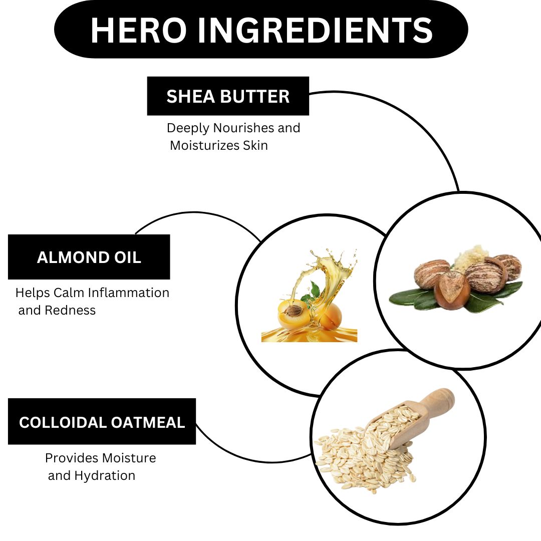 - Nourishment and Repair: Almond oil and shea butter enrich the skin with vitamins and fatty acids for repair and rejuvenation.