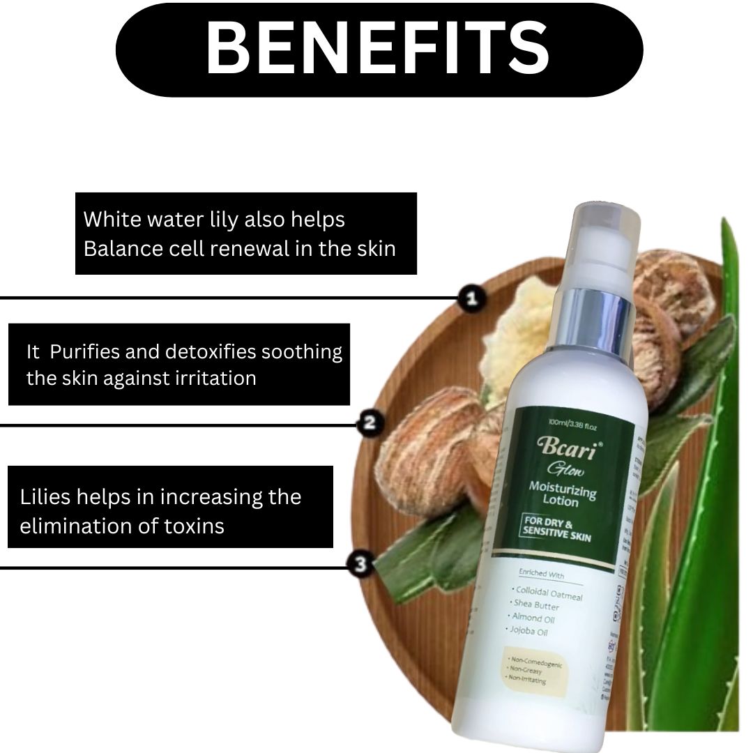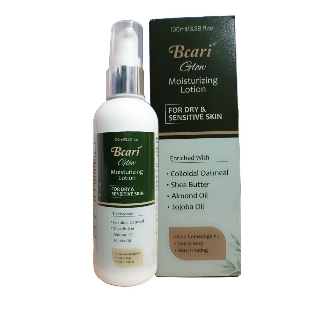Bcari Glow Moisturizing Lotion is specially formulated to deeply nourish and hydrate the skin. Enriched with Shea Butter, Almond Oil, Jojoba Oil, and Colloidal Oatmeal, this lotion is ideal for dry, sensitive, and irritated skin. It helps restore the skin’s natural moisture balance, leaving it soft, supple, and healthy.
