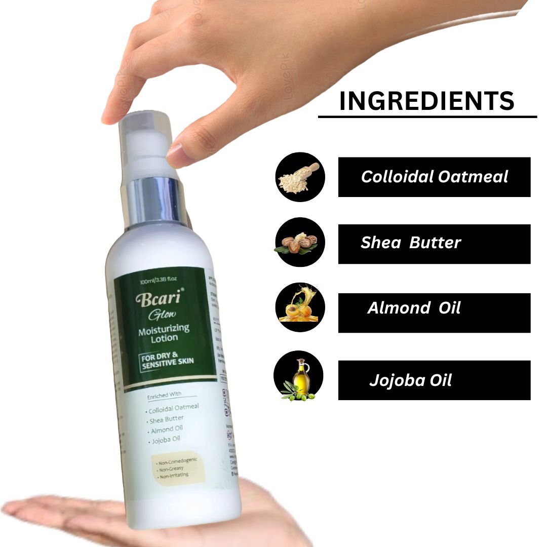 BCARI GLOW Moisturizing Lotion | Deep Hydration | Nourishment and Repair | Non-Gresay Formula | Soothes Irritation | Improves Skin Tone | Enriched with Colloidal Oatmeal, Shea Butter, Almond Oil, Jojoba Oil | For Men & Women (100 ml)
