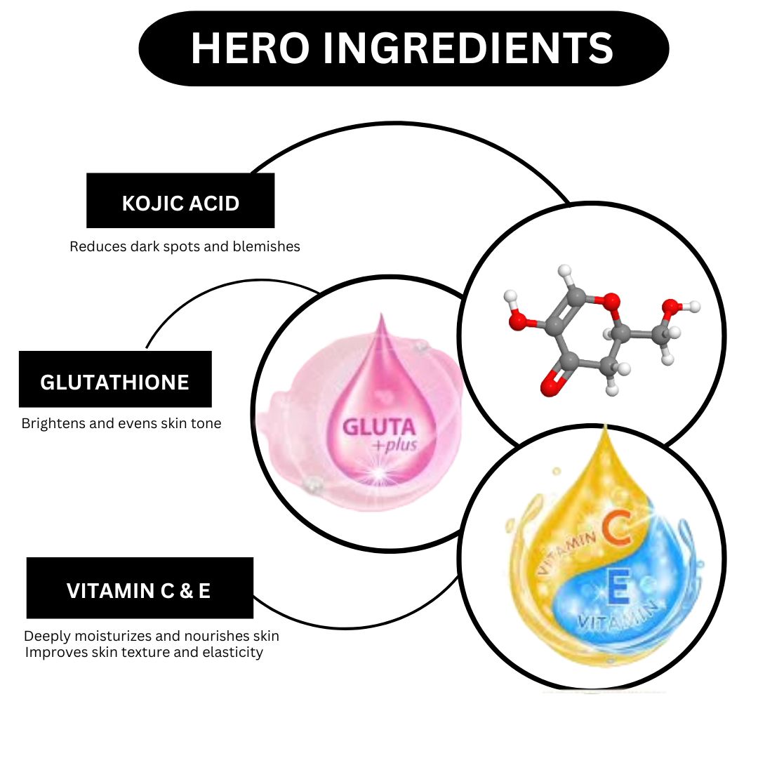 - Skin Brightening: Glutathione, Kojic Acid, and Vitamin C work together to lighten dark spots, hyperpigmentation, and uneven skin tone, leaving the skin with a more radiant, luminous glow.